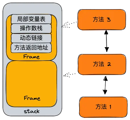 - 每个方法执行都会创建一个栈帧,栈帧包含局部变量表、操作数栈、动态连接、方法出口等。