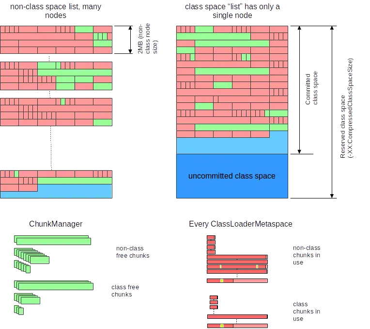 因此,VirtualSpaceList及其节点是全局结构,而Metachunk属于一个类加载器。VirtualSpaceList中的单个节点可能并且经常包含来自不同类加载器的chunk: