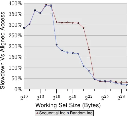 这个基准测试的结果可能令人惊讶(也可能不是)。如果工作集适合L2,帮助线程的开销会降低10%到60%的性能(主要是在低端,再次忽略最小的工作集大小,噪音太高)。这应该是意料之中的,因为如果所有数据都已经在L2缓存中,预取帮助线程只使用系统资源而不会对执行做出贡献。