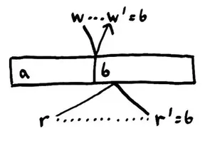 线性化是强大的武器。一旦一个操作完成,它或它之后的某一状态将对所有参与者可见。因为每个操作一定发生在它的完成时间之前,且任何之后被调用的操作一定发生在调用时间之后,也就是在原操作本身之后。 一旦我们成功写入b,每个之后调用的读请求都可以读到b,如果有更多的写操作发生的话,也可以是b之后的某个值。