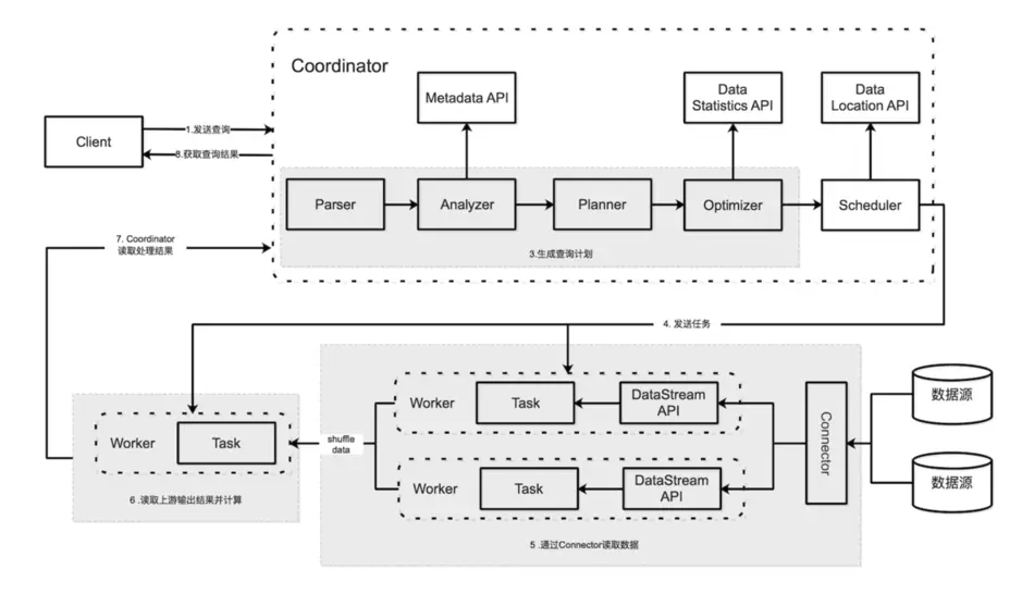 Trino Worker是集群中工作节点,负责执行任务和处理数据。Worker从连接器获取数据并相互交换中间数据。协调器负责从Worker获取结果并将最终结果返回给客户端。