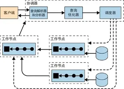 在工作节点处理数据的同时,协调器会将结果抽取出来放到输出缓冲区中,并将缓冲区的内容暴露给客户端。一旦客户端读完输出缓冲区的内容,协调器就会代表客户端向工作节点请求更多的数据。另外,工作节点也在不断地与数据源交互并从中读取数据。最终,客户端不断地请求数据,工作节点则不断地从数据源读取数据并提供给客户端,直到查询执行结束。