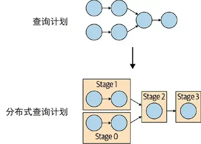 包含查询的阶段层次结构类似于树。每个查询都有一个根阶段,负责聚合其他阶段的输出。阶段是协调器用来对分布式查询计划进行建模的阶段,但阶段本身不会在 Trino 工作线程上运行。