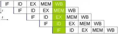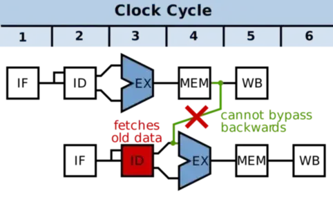 在下面的例子中,第一条指令的MEM级(第4级)之后的可用数据需要作为第二条指令的EX级(第3级)的输入。如果没有气泡,EX级(第3级)只能访问前一个EX级的输出。因此,添加气泡可以解决时间依赖性,而无需在时间上向后传播数据(这是不可能的)。