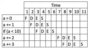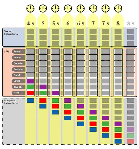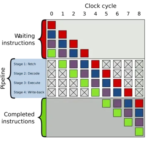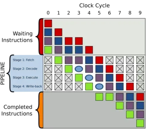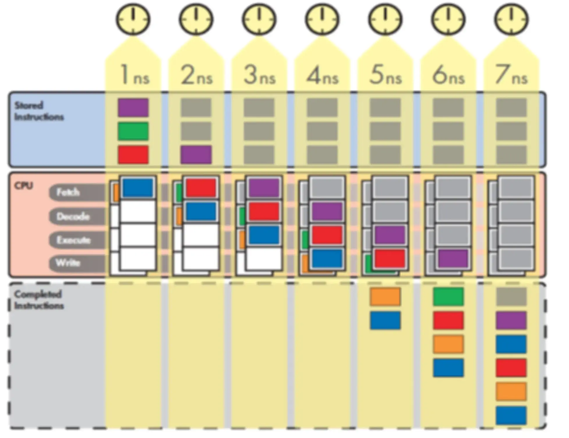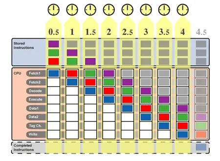 上述每个阶段都可以说代表指令“生命周期”中的一个阶段。指令从获取阶段开始,进入解码阶段,然后进入执行阶段,中间可能会访问内存,最后进入写入阶段。 每个阶段都需要固定但绝不相等的时间。在本文的示例中,所有阶段花费的时间相等;在实际处理器中通常不是这种情况。在任何情况下,如果一个简单的示例处理器需要1纳秒才能完成每个阶段,那么该处理器可以每5纳秒完成一条指令。